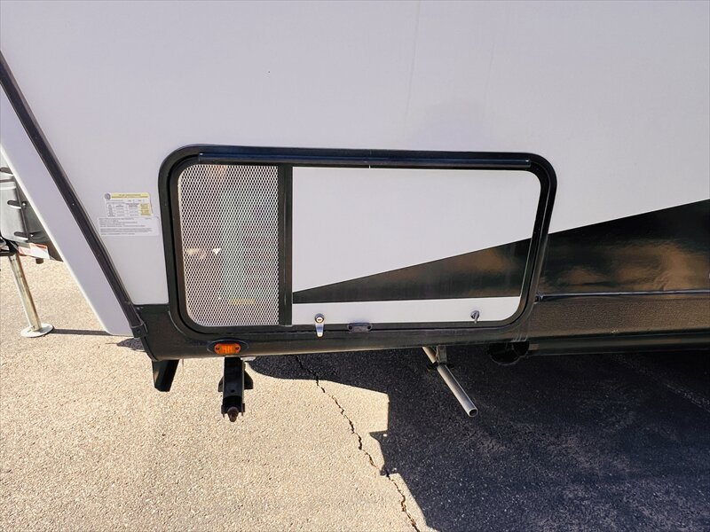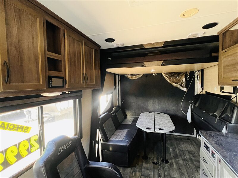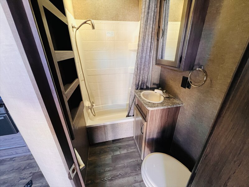 This toy hauler travel trailer features a spacious bathroom with skylight,, lots of storage, etc.