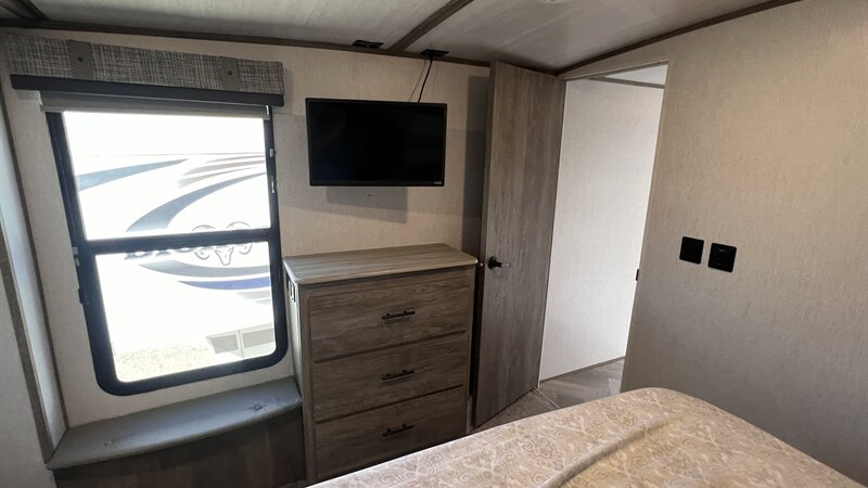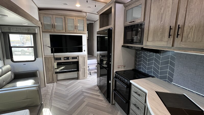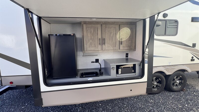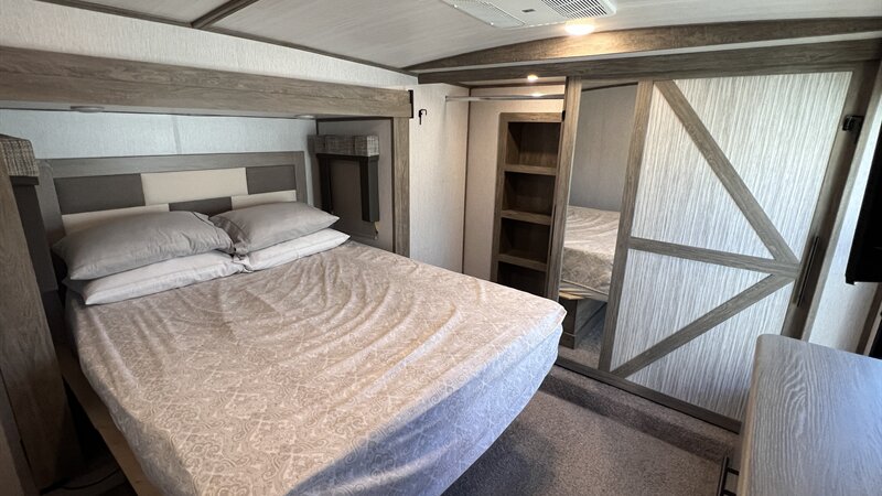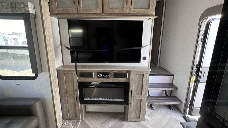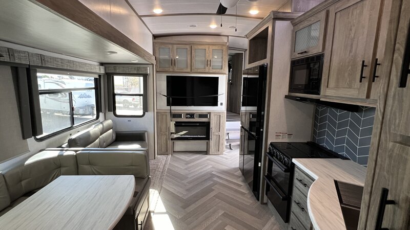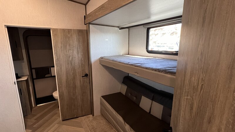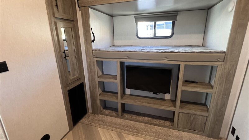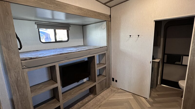 Great family floor plan! 4 slide outs. Bunk room has dual top bunks, a queen sofa/ bed, and it’s own full bath with ample storage and exit door to outside. The front bedroom has queen bed, wall mounted TV, dresser and double barn door closet with W/D hookups. Front bathroom has a large double slide door shower . Living area has spacious kitchen, oversized fridge, fireplace, TV, indoor/outdoor stereo speakers, u shape dinette/bed, sleeper sofa, and blackout shades. 2 AC units, large pass through storage area, outdoor kitchen with sink, griddle, and mini fridge and awning.