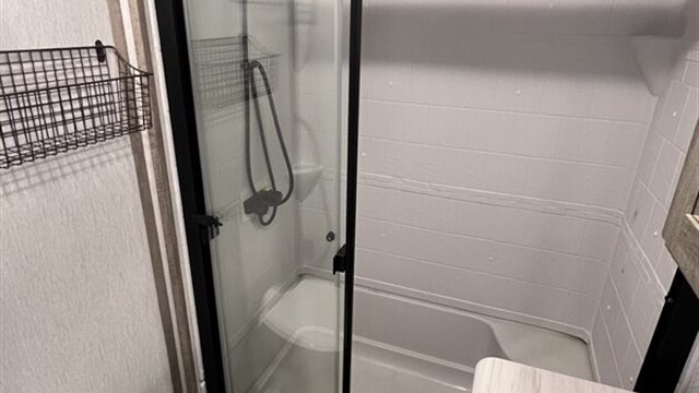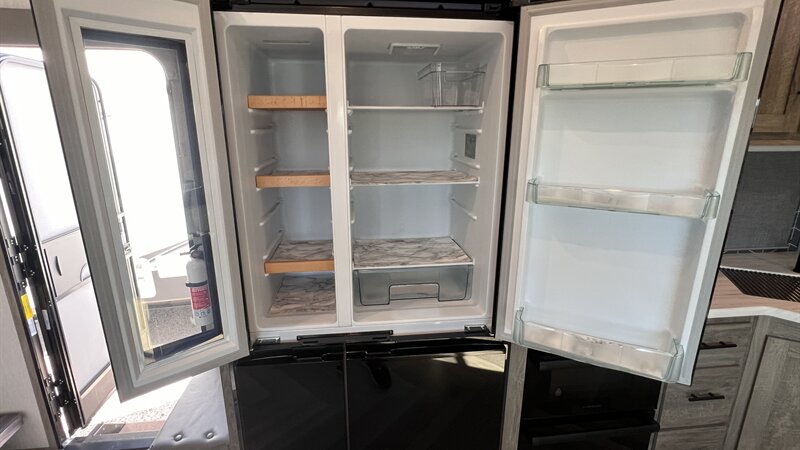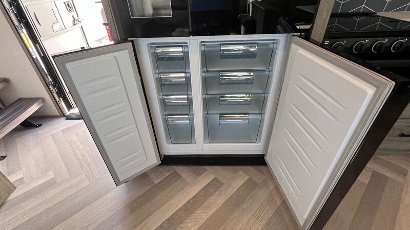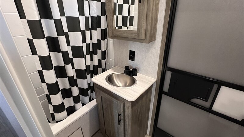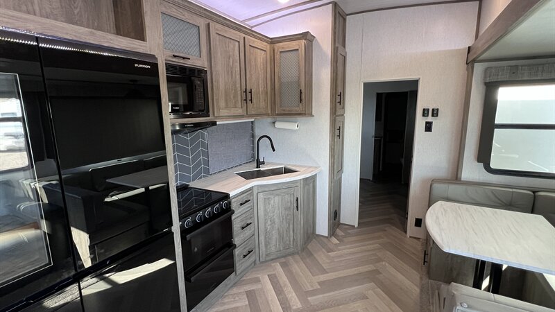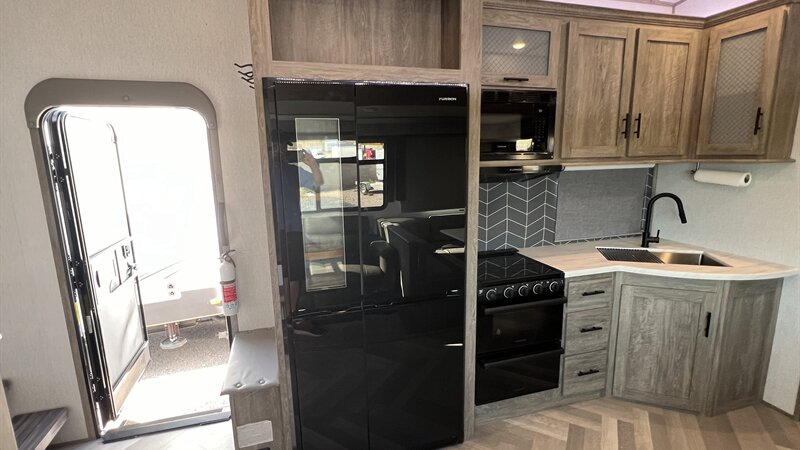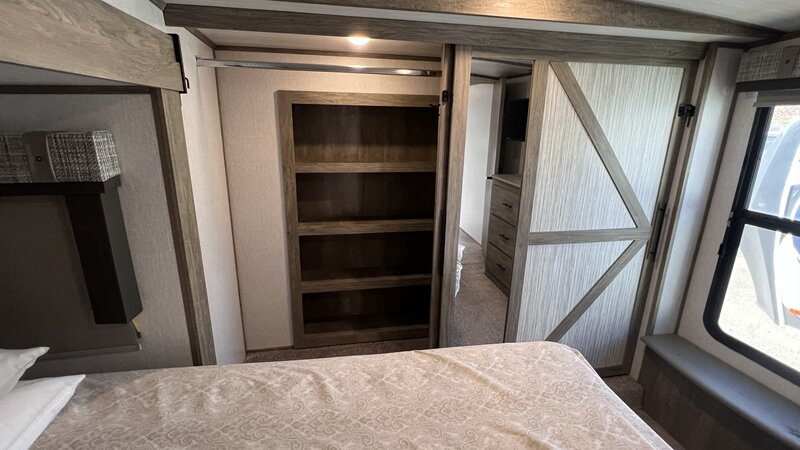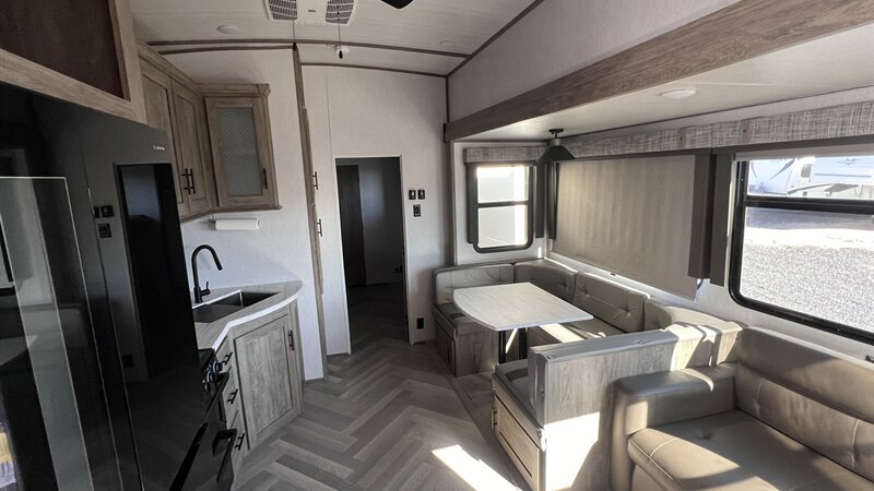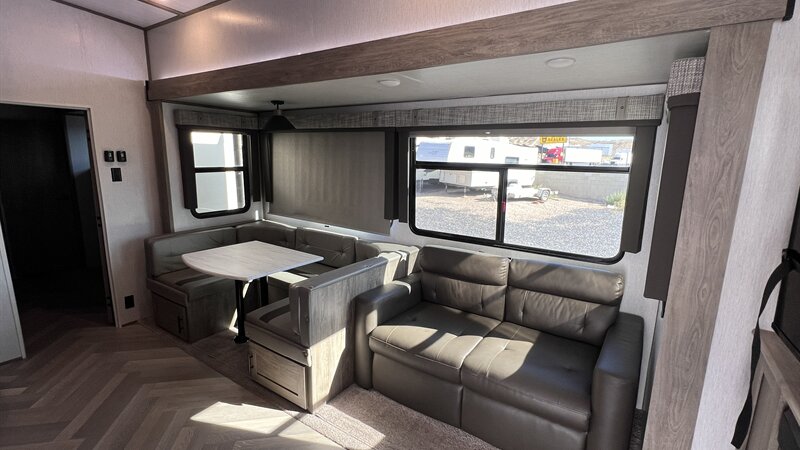 Great family floor plan! 4 slide outs. Bunk room has dual top bunks, a queen sofa/ bed, and it’s own full bath with ample storage and exit door to outside. The front bedroom has queen bed, wall mounted TV, dresser and double barn door closet with W/D hookups. Front bathroom has a large double slide door shower . Living area has spacious kitchen, oversized fridge, fireplace, TV, indoor/outdoor stereo speakers, u shape dinette/bed, sleeper sofa, and blackout shades. 2 AC units, large pass through storage area, outdoor kitchen with sink, griddle, and mini fridge and awning.