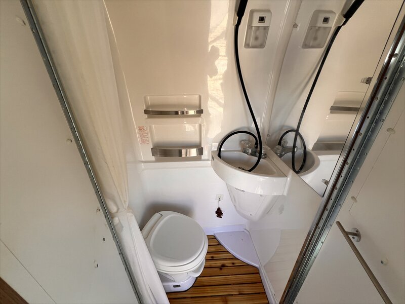 You can prepare at-home meals in the galley that features a two-burner propane stove, a 5-cu. ft. refrigerator,